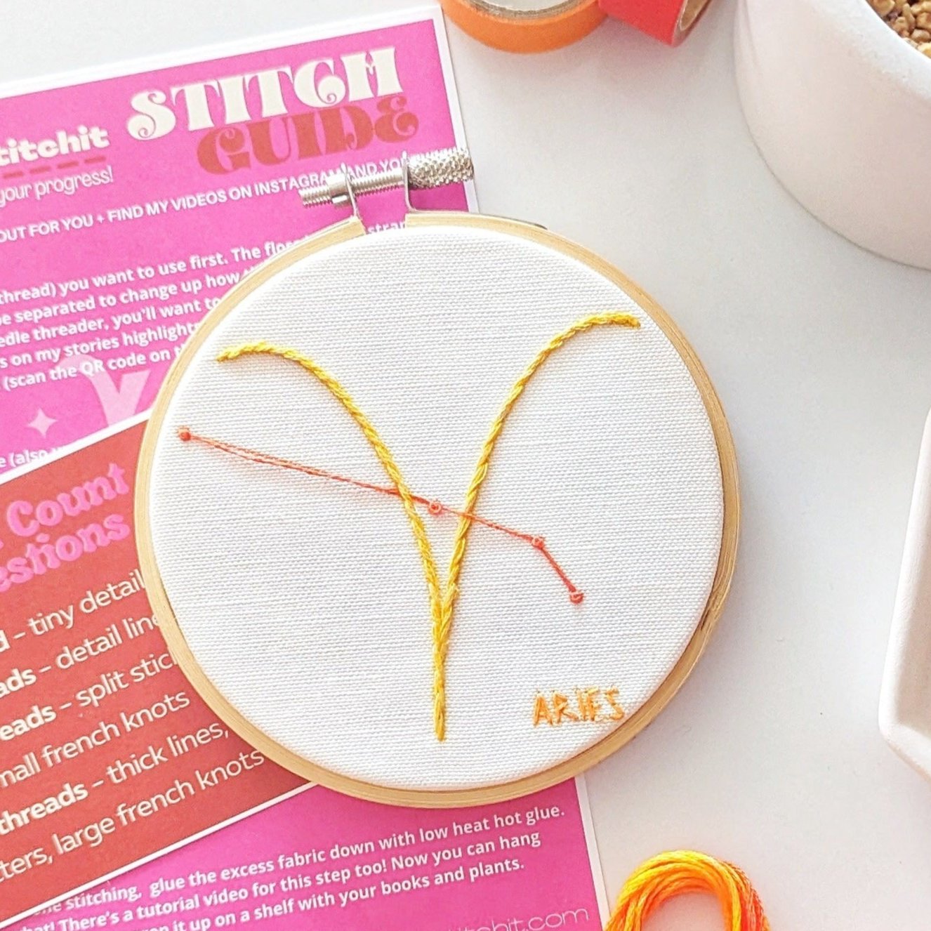 The Aries Mini Kit comes with a 4 inch hoop, and the pattern printed on the fabric. There is a card of embroidery floss especially selected for this kit, a thread count guide and two size 5 embroidery needles.