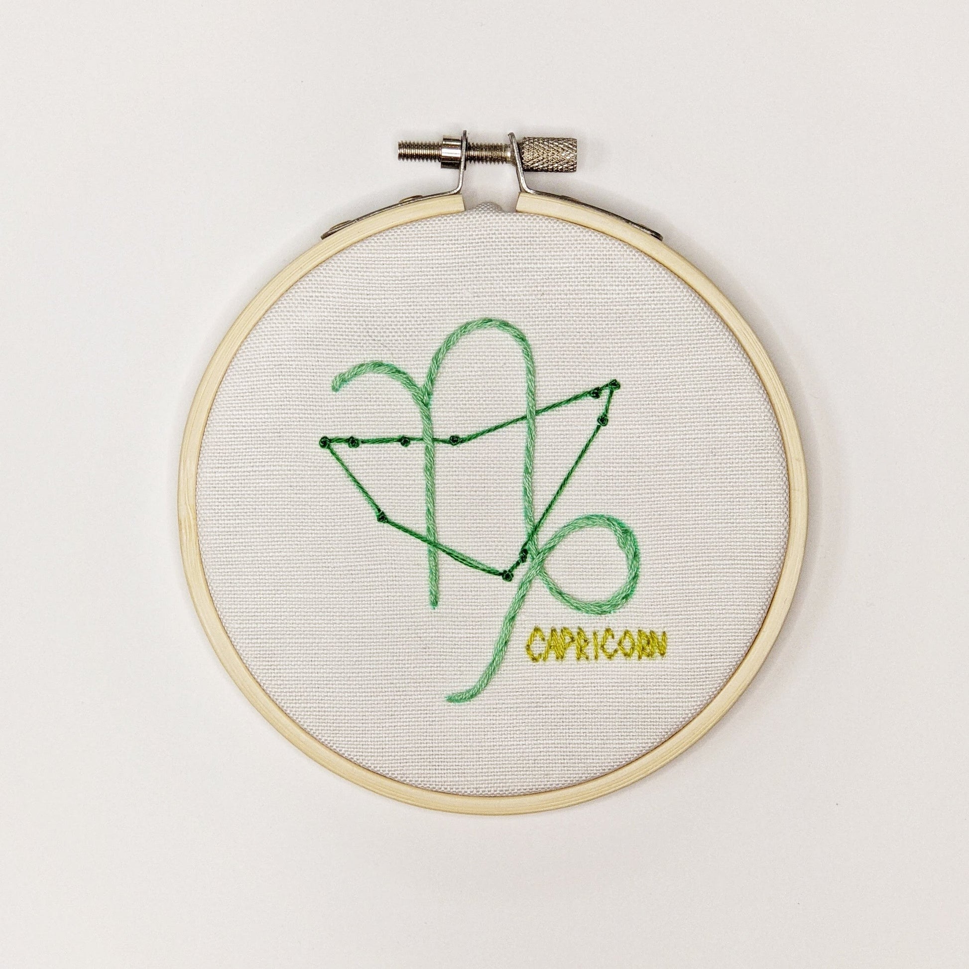The Capricorn Mini Kit comes with a 4 inch hoop, and the pattern printed on the fabric. There is a card of embroidery floss especially selected for this kit, a thread count guide and two size 5 embroidery needles.