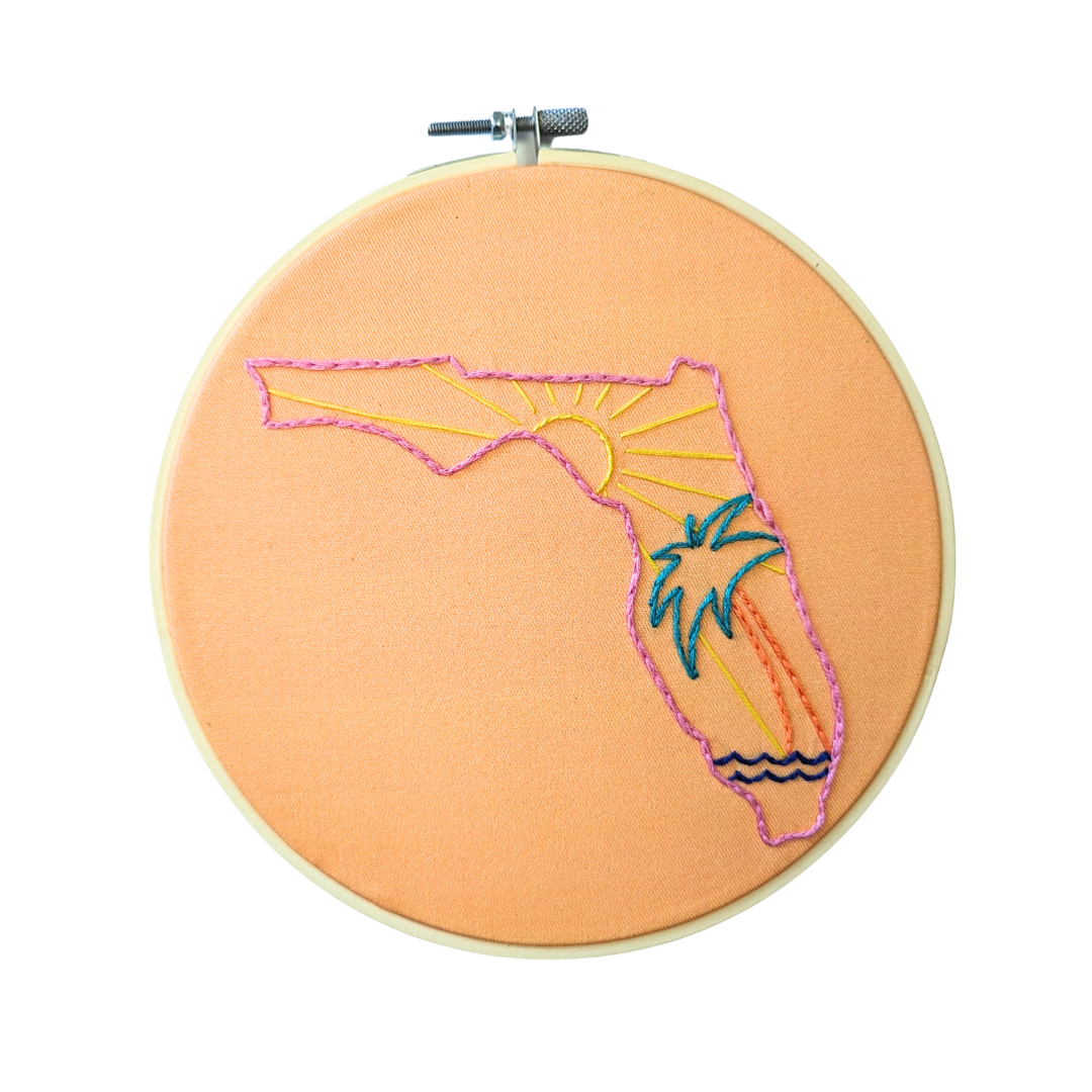 The Florida Sun Kit comes with a 7 inch hoop, and the pattern printed on the fabric. There is a card of embroidery floss especially selected for this kit, a thread count guide and two size 5 embroidery needles.