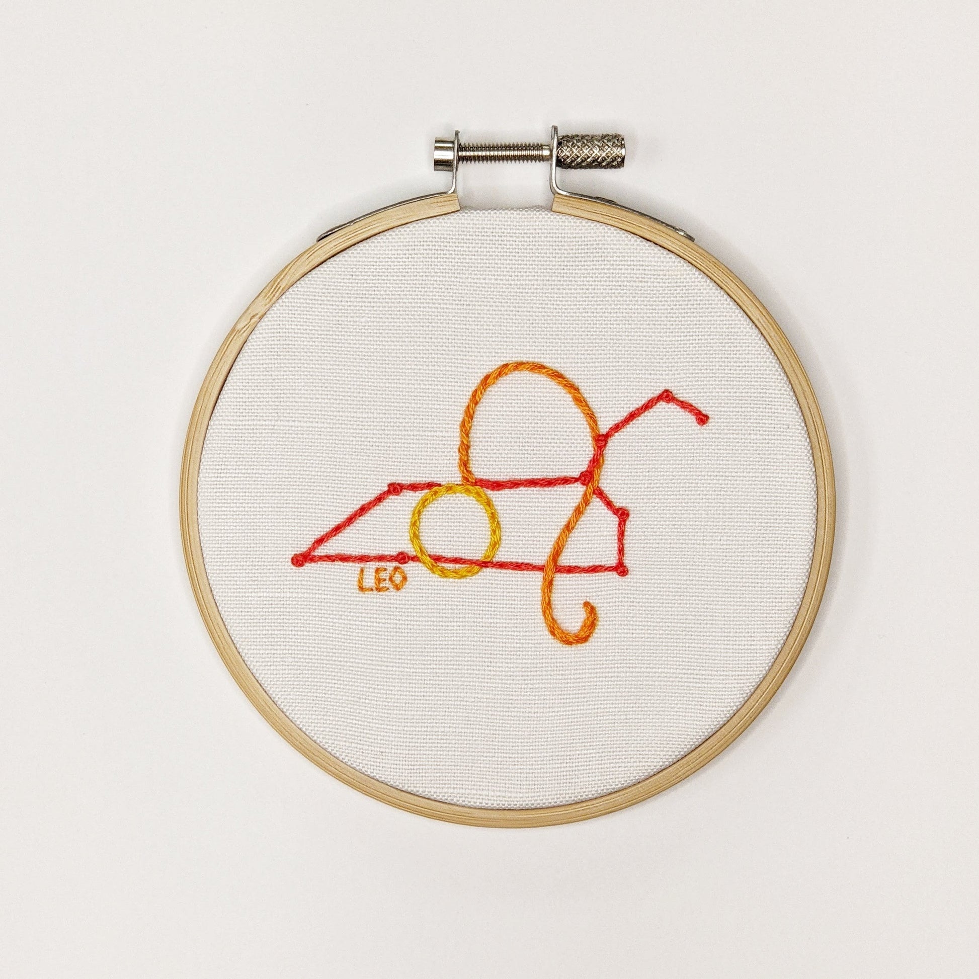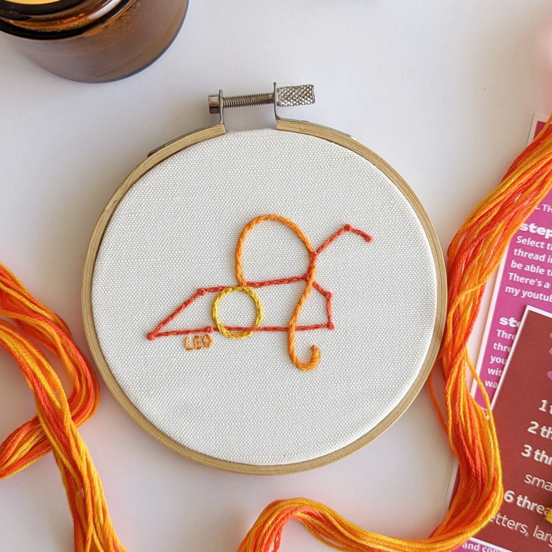 The Leo Mini Kit comes with a 4 inch hoop, and the pattern printed on the fabric. There is a card of embroidery floss especially selected for this kit, a thread count guide and two size 5 embroidery needles.