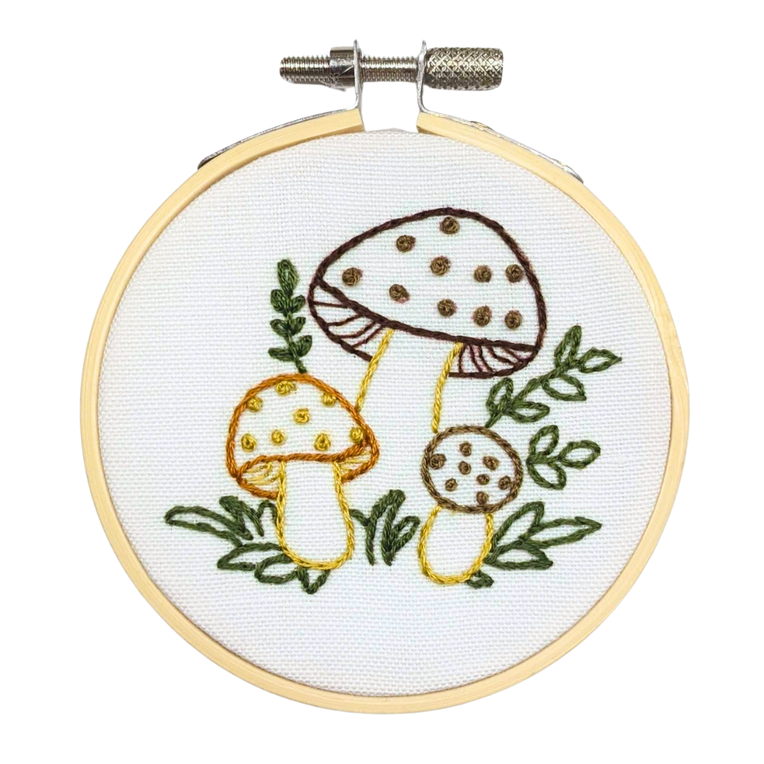The Mushroom Mini Kit comes with a 3 inch hoop, and the pattern printed on the fabric. There is a card of embroidery floss especially selected for this kit, a thread count guide and two size 5 embroidery needles.