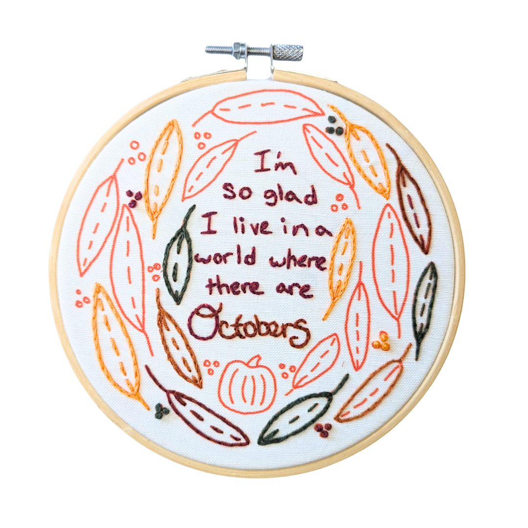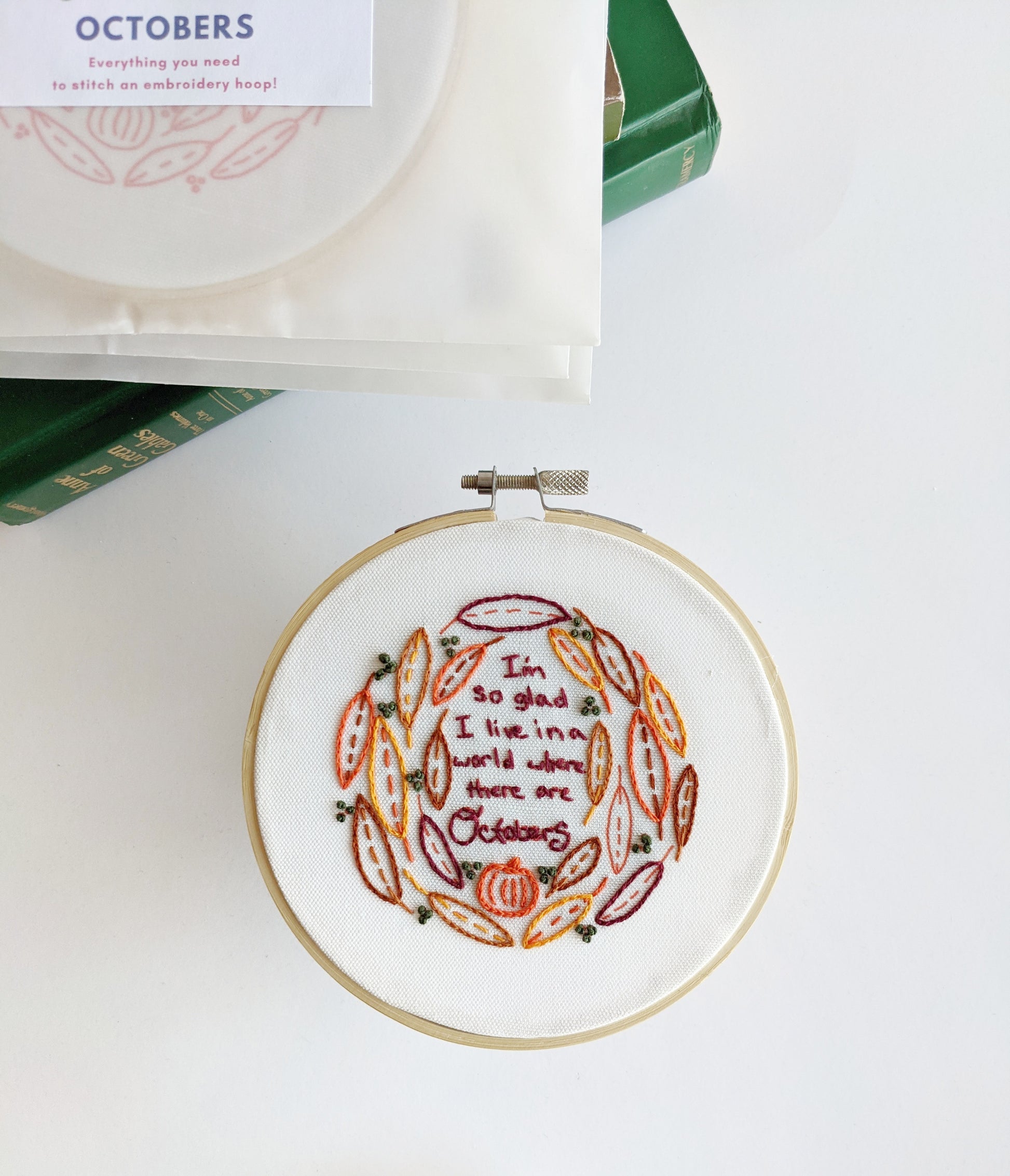 The Octobers Kit comes with a 6 inch hoop, and the pattern printed on the fabric. There is a card of embroidery floss especially selected for this kit, a thread count guide and two size 5 embroidery needles.