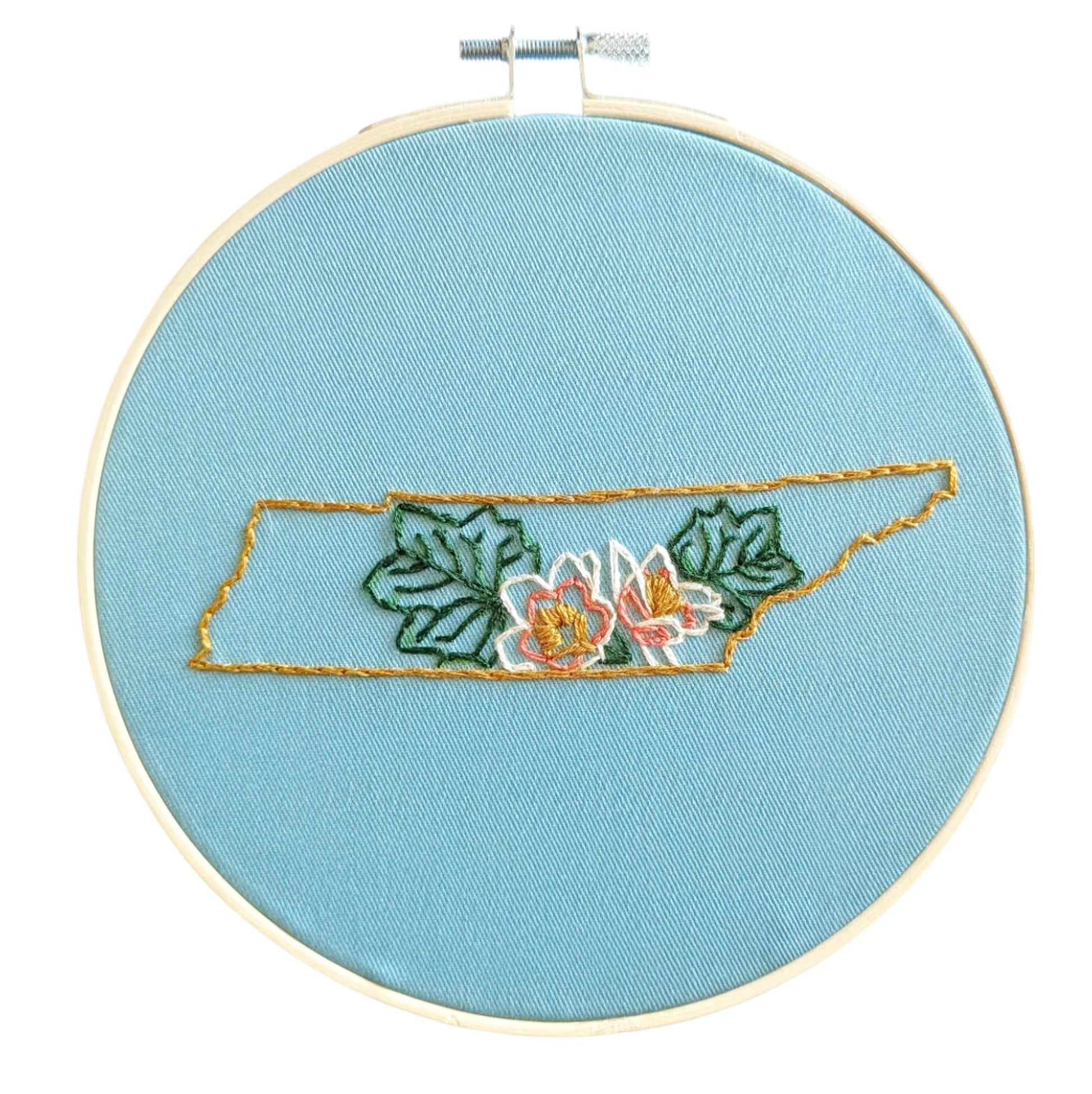 The Tennessee Tulip Tree Kit comes with a 5 inch hoop, and the pattern printed on the fabric. There is a card of embroidery floss especially selected for this kit, a thread count guide and two size 5 embroidery needles.